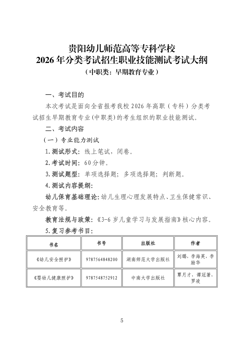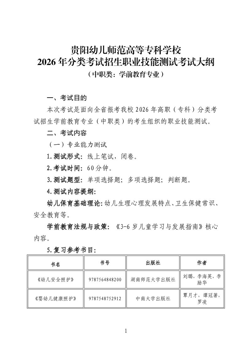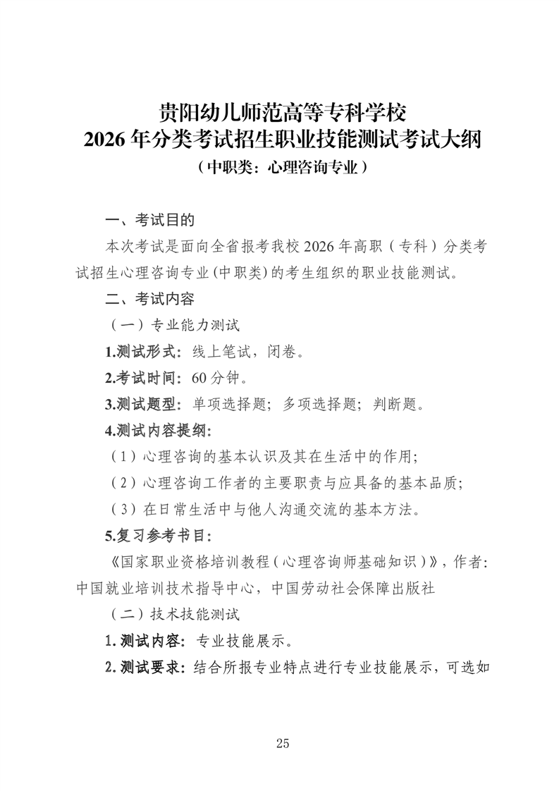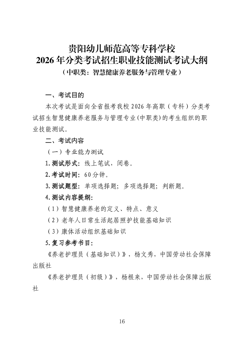 【中职类】贵阳幼儿师范高等专科学校2026年分类考试招生中职类职业技能测试考试大纲