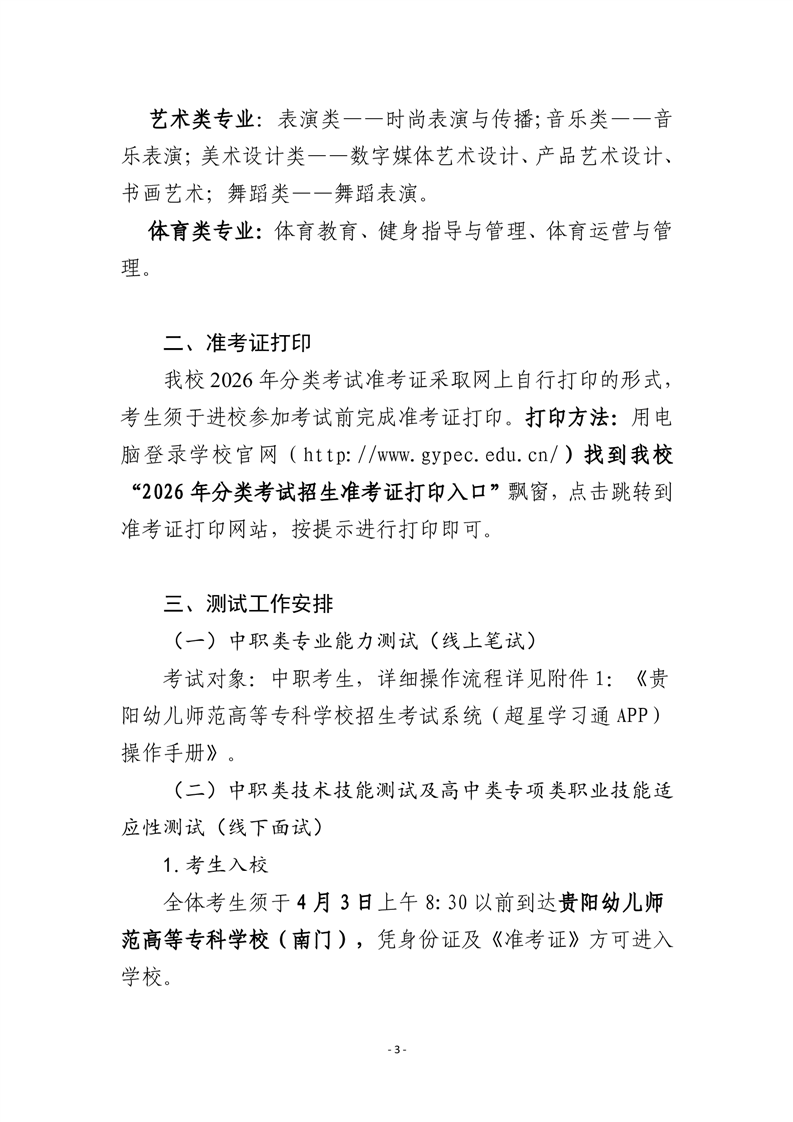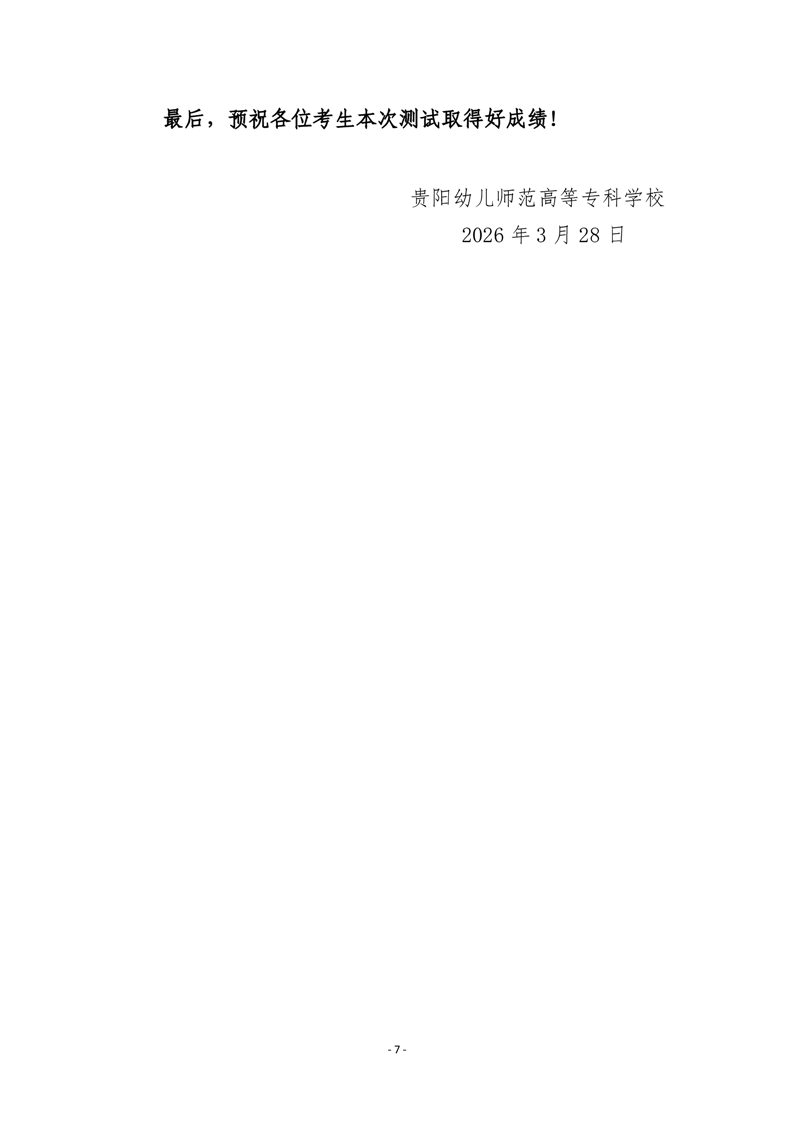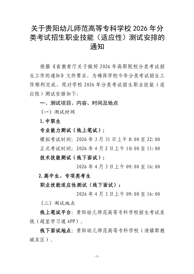 贵阳幼儿师范高等专科学校2026年分类考试招生职业技能(适应性)测试安排